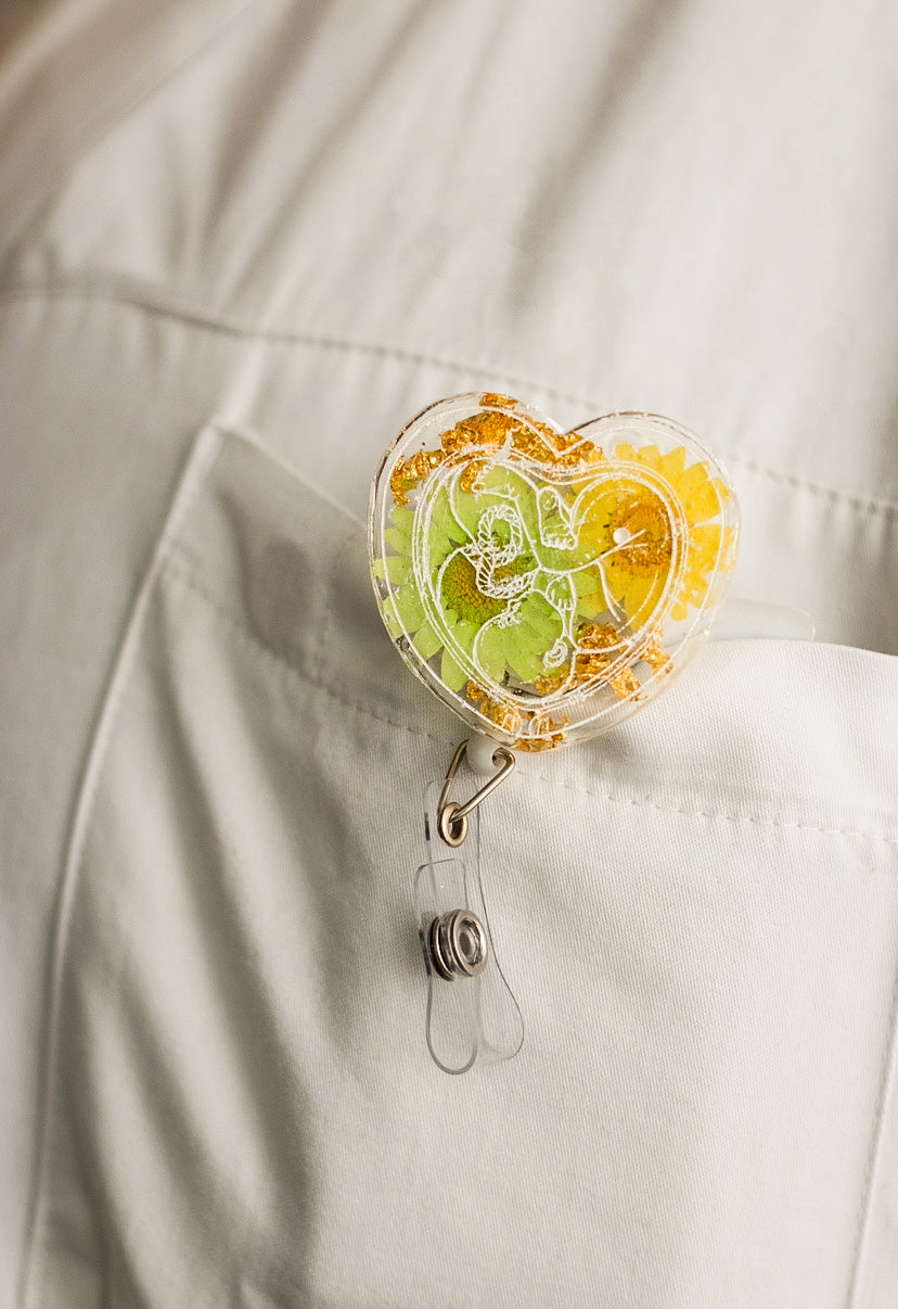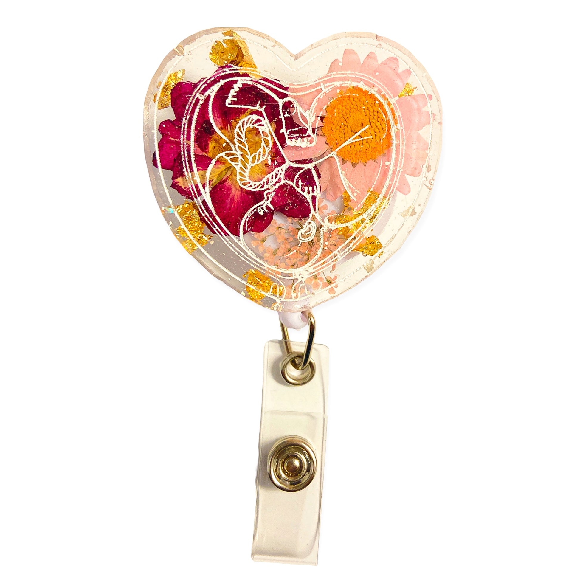 ID holderen er formet som et hjerte med en baby inni en livmor, og den bringer frem følelser av kjærlighet, omsorg og nytt liv. Dette spesielle designet er dedikert til jordmødre og alle som arbeider med babyer. ID holderen vil være et meningsfylt tilbehør til din daglige uniform. Vis stolt frem din profesjonelle identifikasjon mens du bærer med deg symbolikken av det vakre arbeidet du gjør.