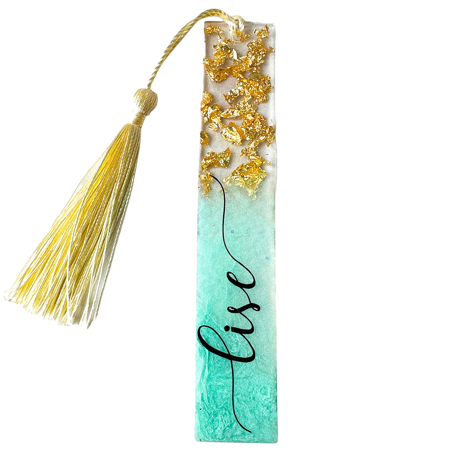 Oppdag våre håndlagde lyseblå og gull bokmerker – en skjønnhetsberikelse for lesingen din. Personliggjør med ditt navn for en unik touch. Berik lesestundene dine i dag!