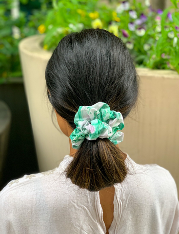 Denne trendye scrunchien, har et abstrakt mønster som lett kan redde inn en dårlig hårdag