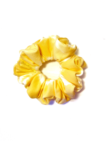 Denne scrunchien er trukket inn i et sterch gult batikkprint. Batikk gir en liten 90 talls throwback vibe.