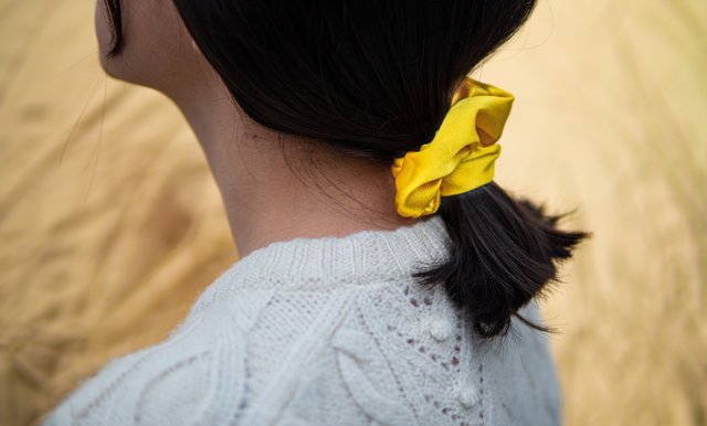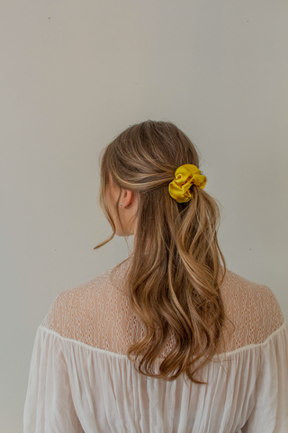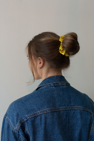 Denne scrunchien er trukket inn i et skinnende gult sateng stoff, noe som gjør den ekstra fin til hårfrisyren.