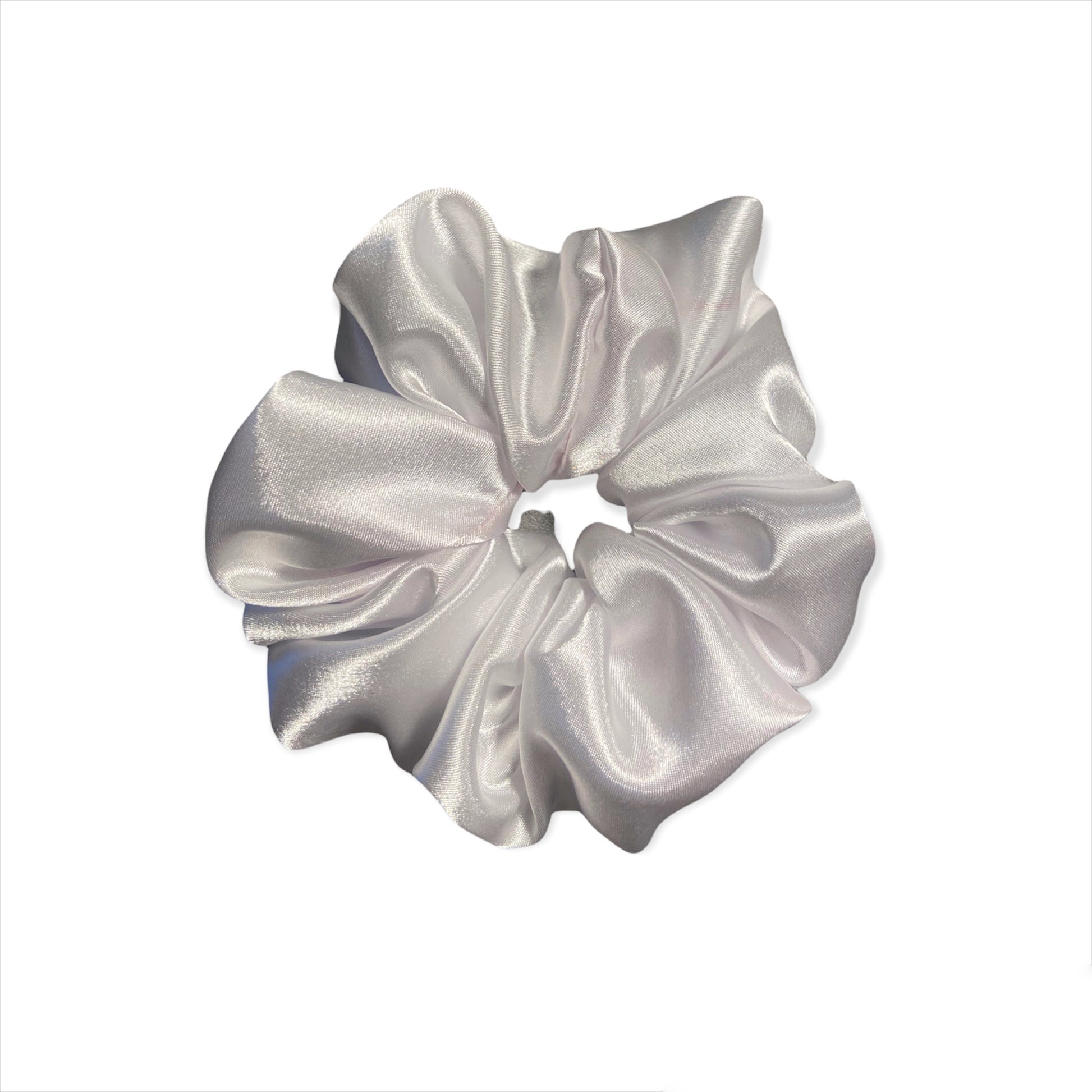 En glans hvit sateng scrunchie, som gir hårfrisyren det lille ekstra.