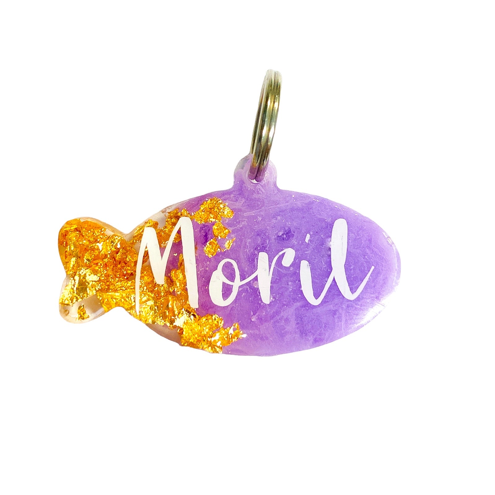Ønsker du å skaffe katten din et vakkert personlig tilbehør, er disse taggene perfekte. Du kan selv velge navn på taggen og om du ønsker telefonnummer eller ikke. Taggen er utformet som en fisk.
