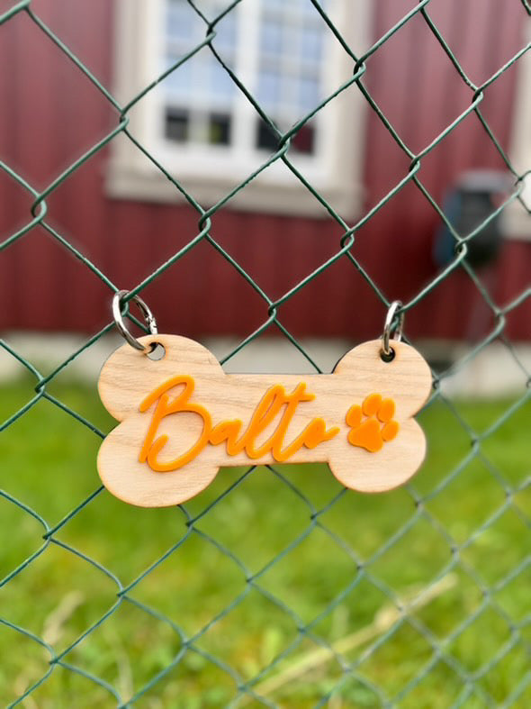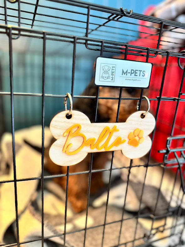 Gjør hundeburet unikt og praktisk med personlig hundeskilt. Skiltet graveres med hundes navn og du kan få eierens telefonnummer på baksiden, noe som gjør den perfekt for ekstra trygghet hvis uhellet skulle være ute.