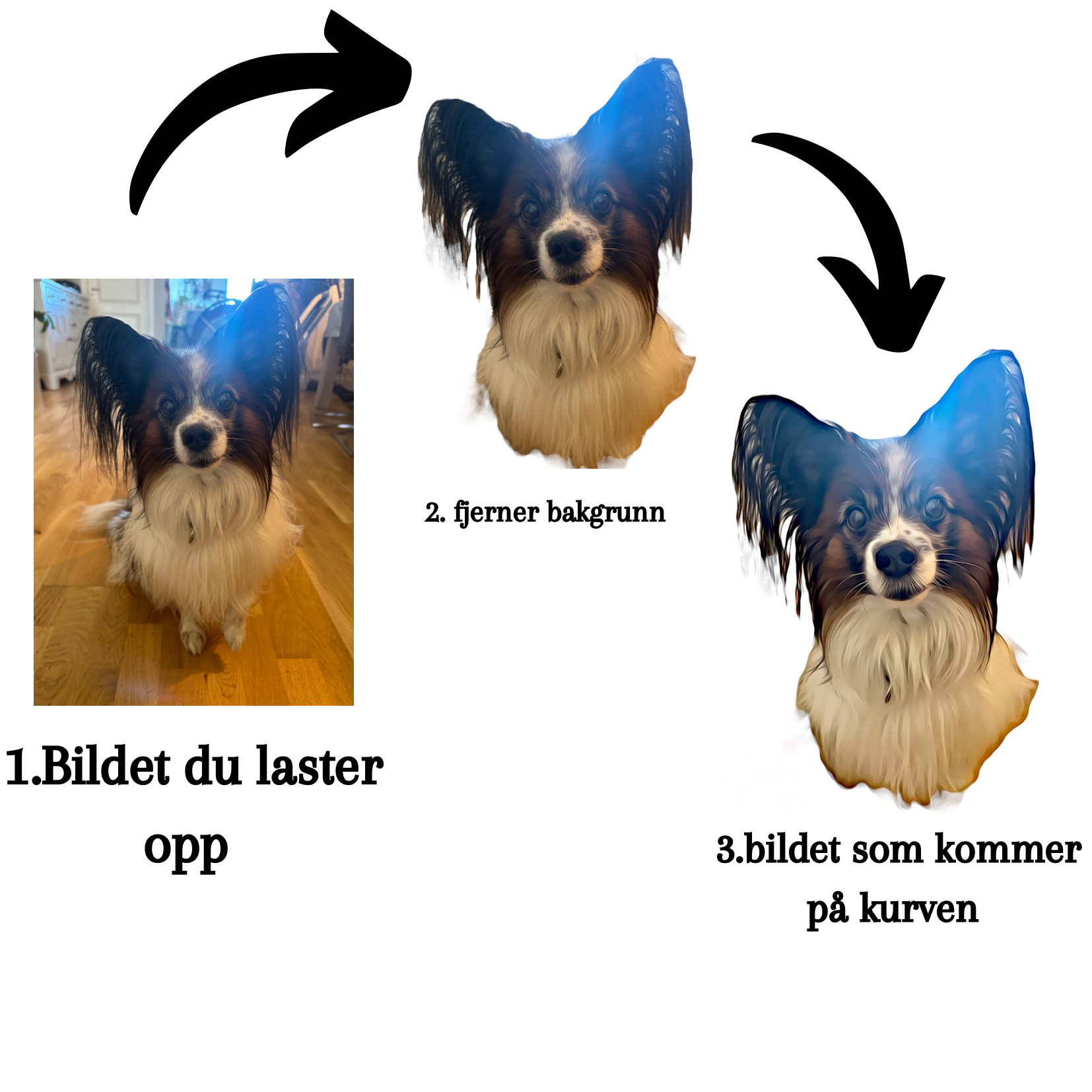 - Velg eget bilde av din hund/ katt som du ønsker på kurven. Bildet vil bli laget om til en tegning av dyret ditt.