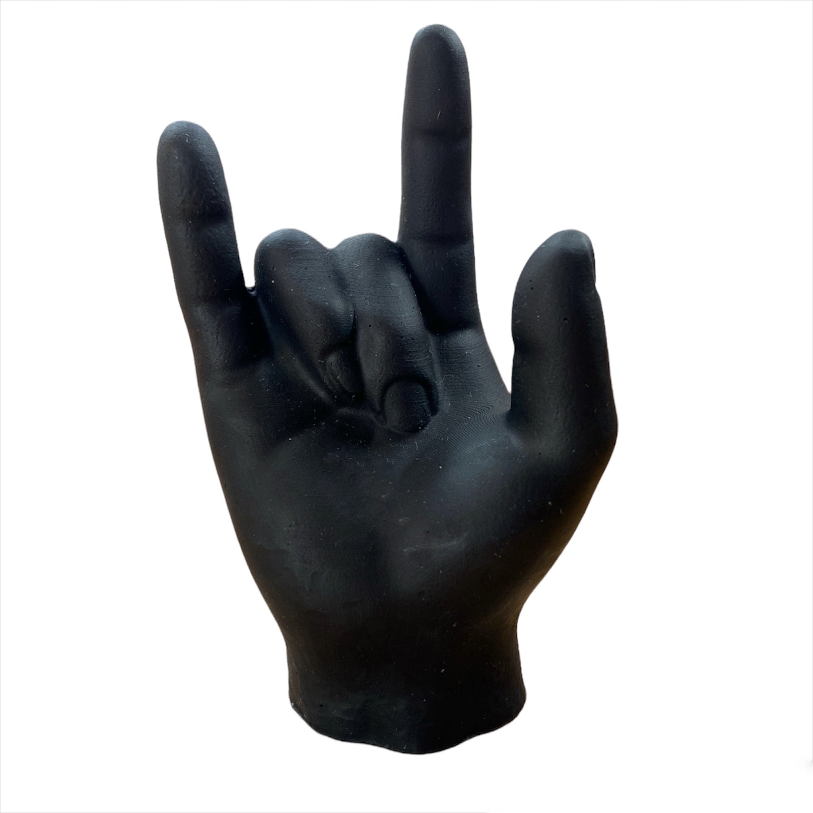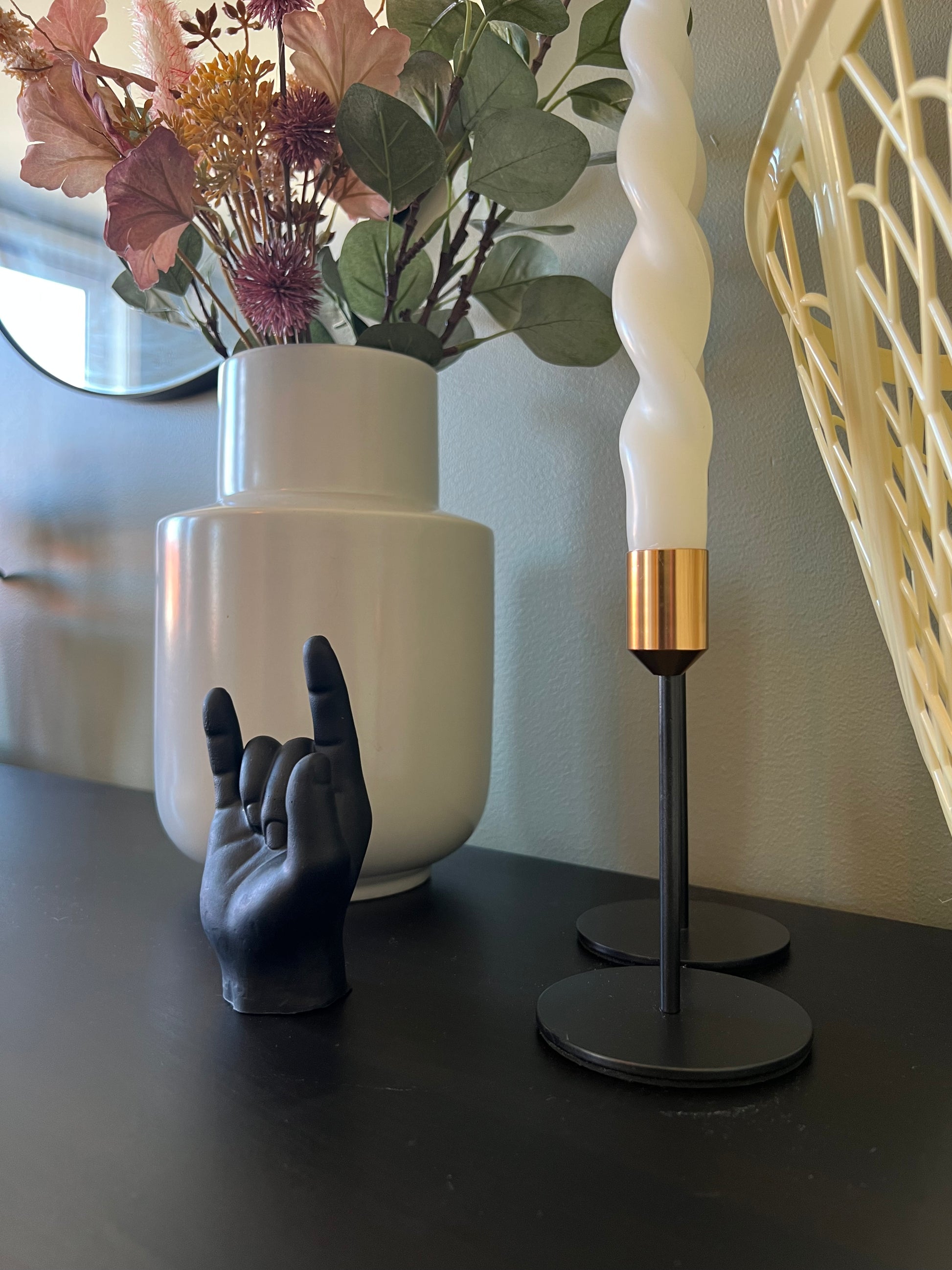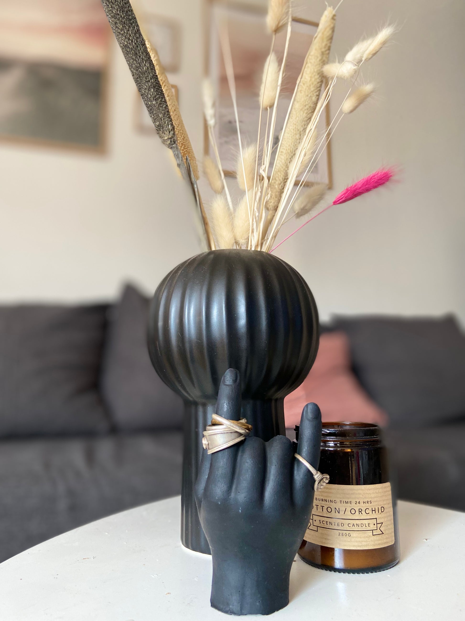 Svart hånd, som passer fint som bare pynt men også passer ypperlig til å oppbevare ringer på.