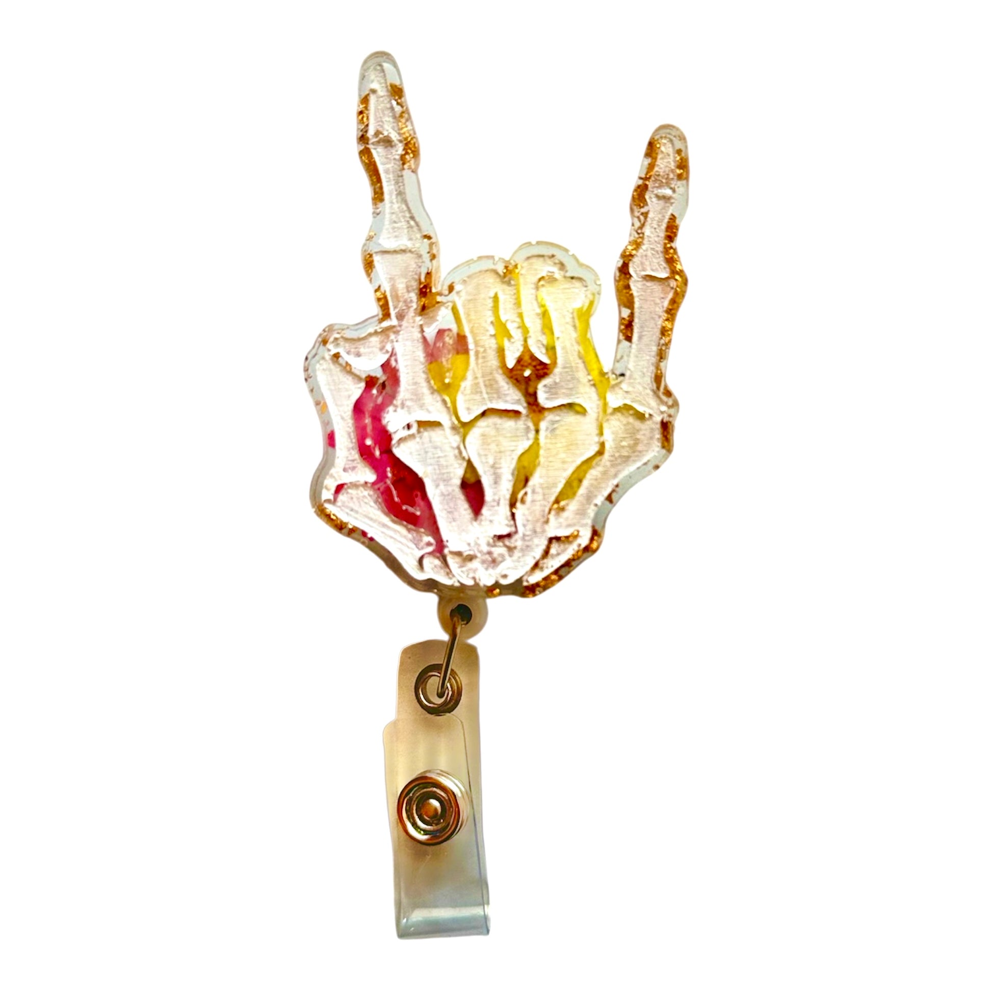 Gi ID-kortet ditt litt personlighet med denne unike ID-holderen i form av en skjeletthånd som viser “rock on”-tegnet! Perfekt for radiografer eller andre yrkesgrupper.