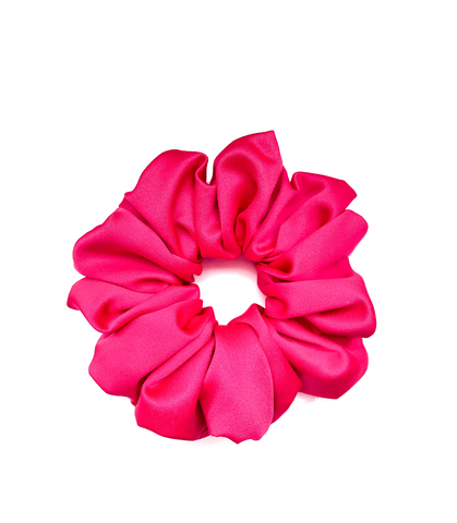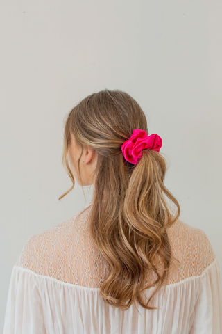 Denne knæsj rosa sateng scrunchien passer til både store og små, den gir en fin detalj til hårfrisyren .