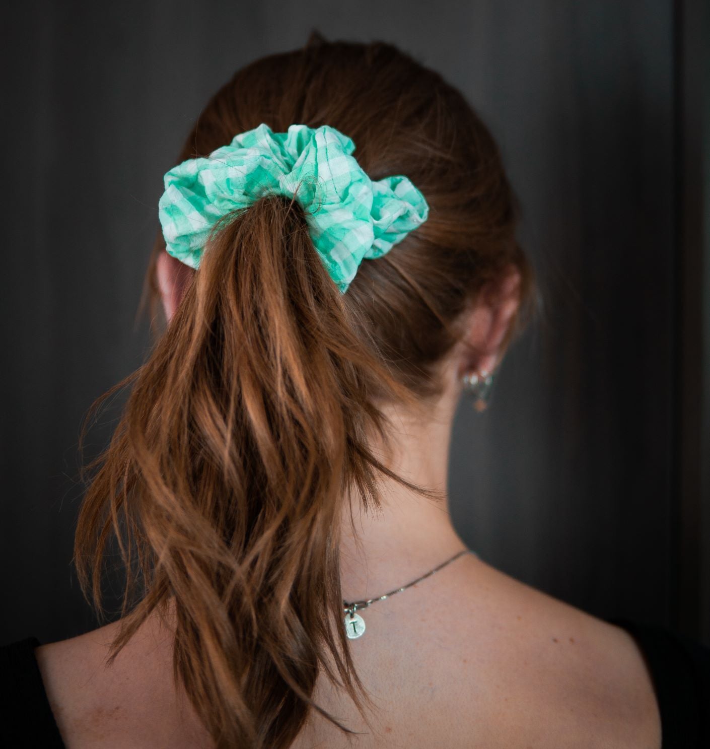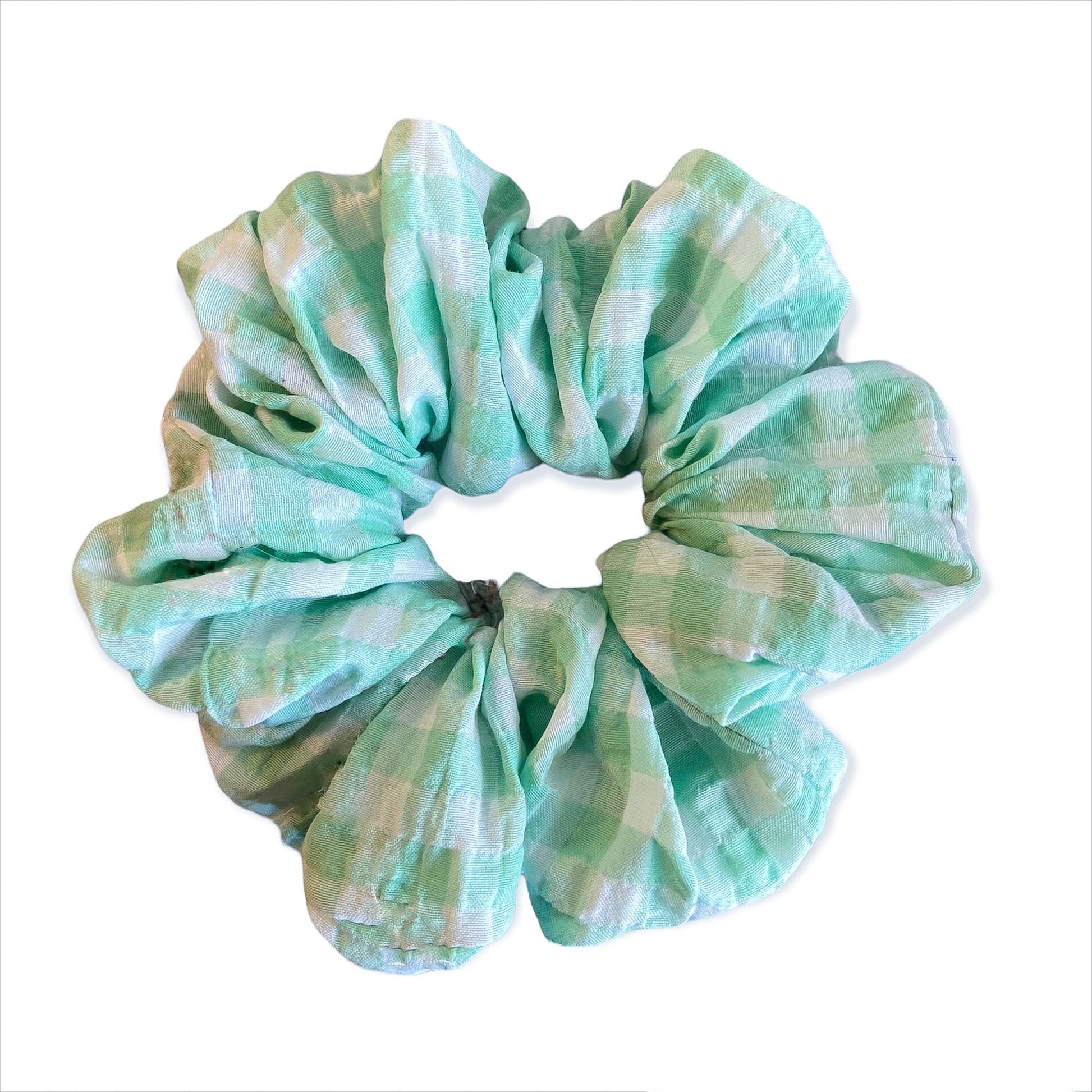 Denne scrunchien har en farge av turkis og hvit i et rutete mønster, noe som er perfekt for sommeren. Viste du at rutete er ganske inn!