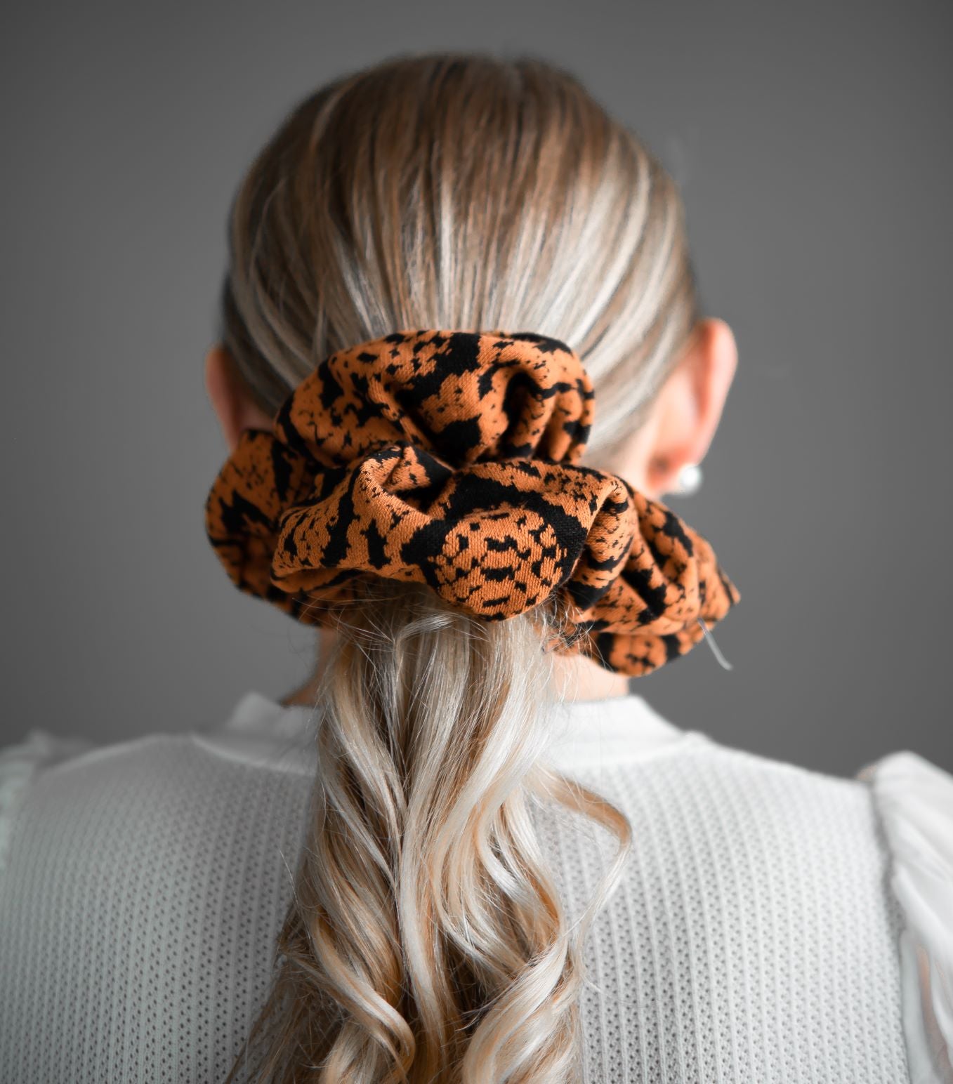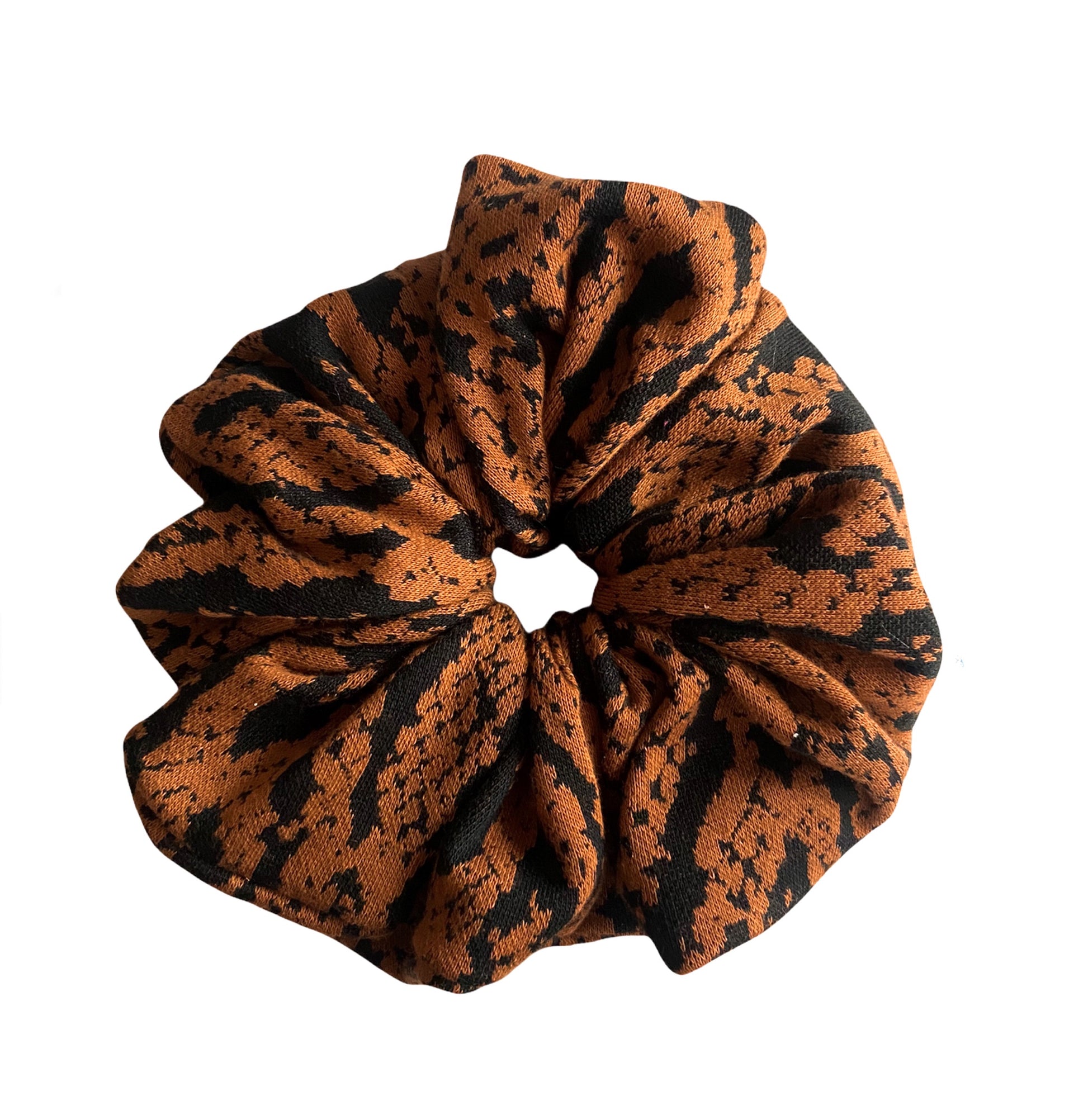 Denne XL scrrunchien er svart og brun i et spennende slangemønster.