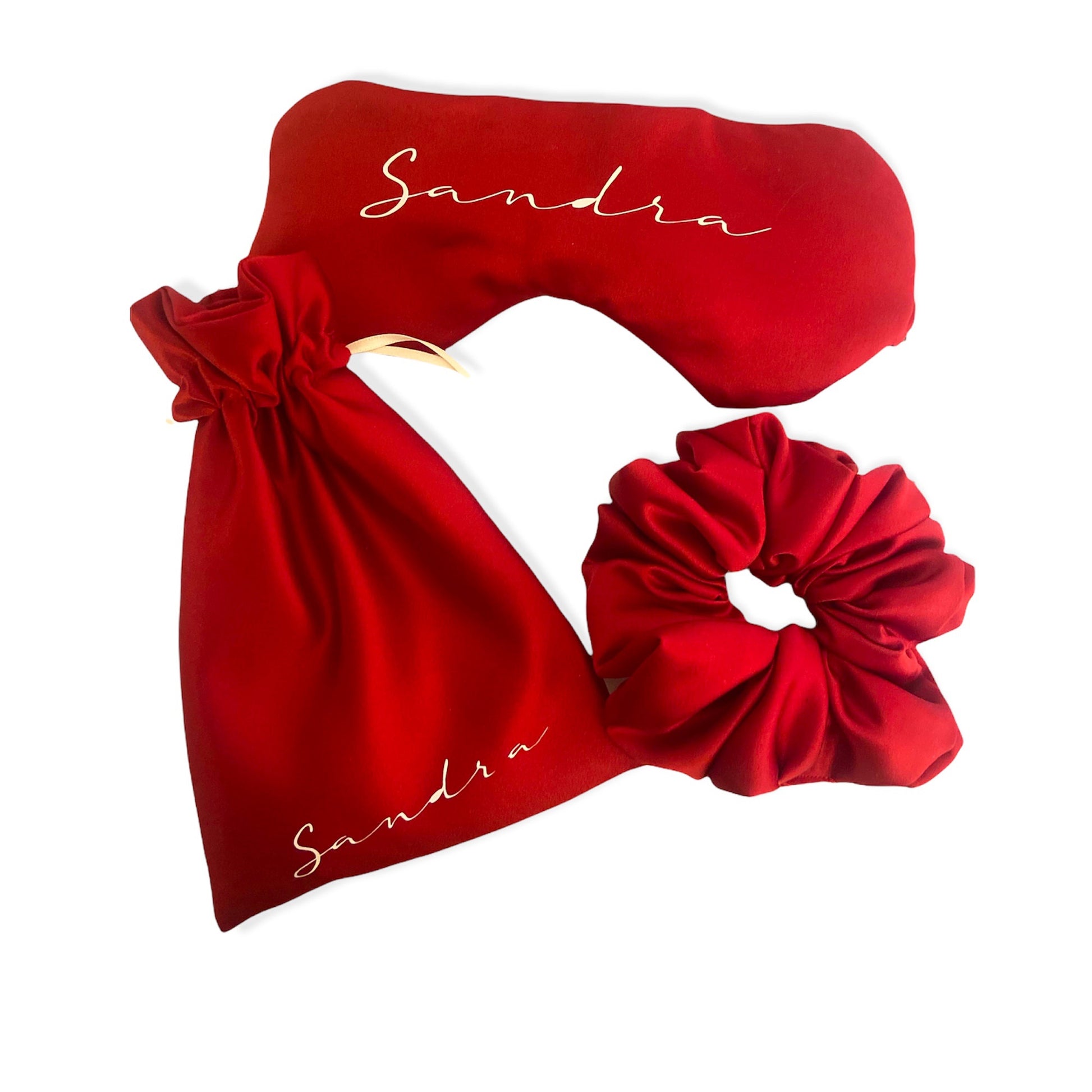 En god natt søvn har mye å si for helsen. For å sikre at du får en god natt med søvn, er denne sovemasken tykk og myk sateng. Du kan gjøre masken så personlig som du vil ved å velge navn eller annet tekst som du selv ønsker. Derfor er dette settet perfekt til gaver, om du vil gjøre gaven mer personlig. I dette settet følger det med en rød scrunchie og en pose som du kan legge både sovemasken og scrunchien i når det ikke er i bruk.