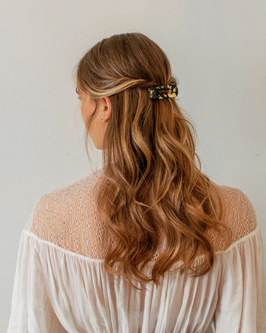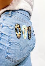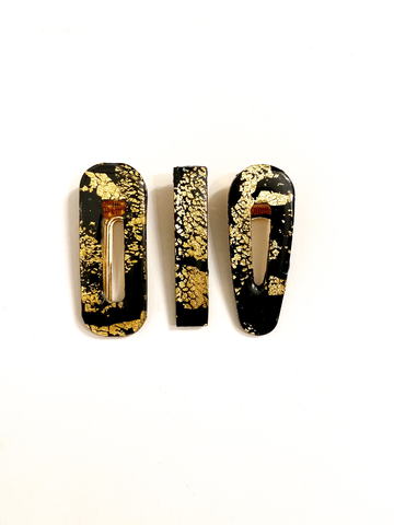 Spenner med svart og gull overflate, spennene er gullfarget på undersiden. Spennene kommer i et sett med tre forskjellige former på spennene. Settet er et dekorativt hår tilbehør som holder håret på plass.