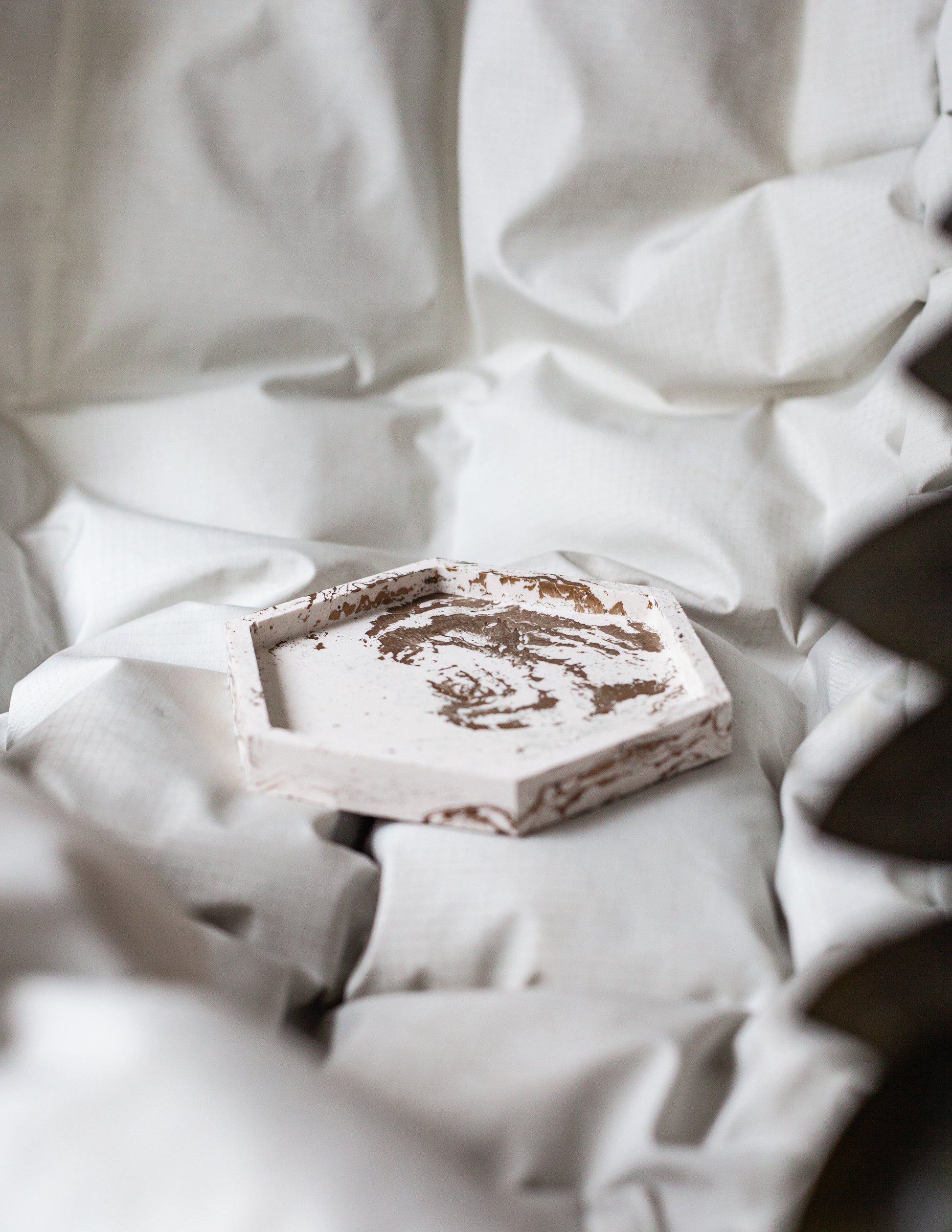 Dette rektangulære Vandelay fatet er laget for hånd av Jesmonite i Gull og hvit. Fatet blir fort en iøynefallende detalj i hjemmet ditt, og kan brukes til så mangt, slik som fat til såpe eller lys osv.