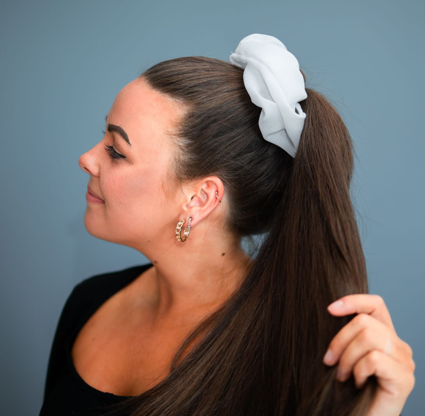 Denne XL scrunchien er en av favorittene her hos kundene til Geli , scrunchien er trukket inn i et stoff som er nesten slik at man kan se igjennom det.